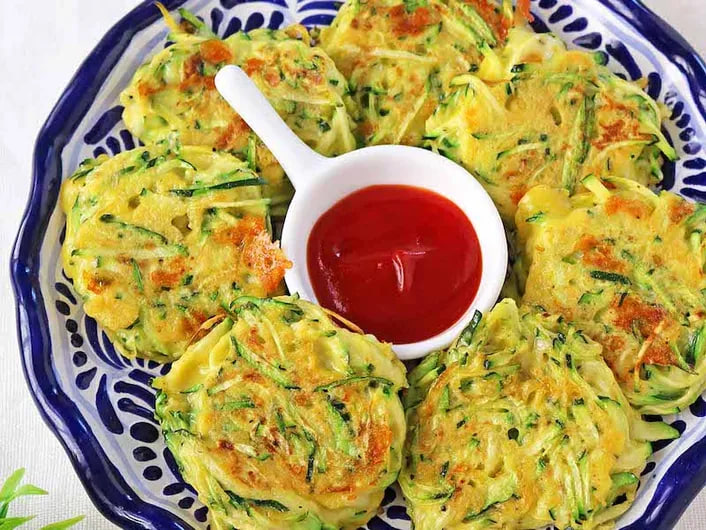 คำตอบ: ซูคินี 1 ลูก, ไข่ไก่ 1 ฟอง, แป้งสาลีอเนกประสงค์ 3–4 ช้อนโต๊ะ, ชีสขูด 40 กรัม, น้ำมันมะกอก 1 ช้อนโต๊ะ และเกลือเล็กน้อย